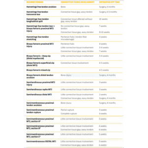 Tabla 1. Tiempos estimados de RTP (Regreso a la Práctica) para lesiones musculares en los isquiotibiales basados en datos del FC Barcelona y experiencia clínica. Tenga en cuenta que son estimaciones iniciales solamente y no tienen en consideración factores específicos del paciente, factores específicos del deporte o modificadores de tolerancia al riesgo.