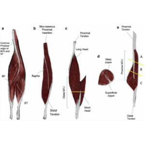 Los isquiotibiales están formados por los músculos semimembranoso (SM), semitendinoso (ST) y bíceps femoral (BF). Este último tiene una cabeza larga y otra corta. Todos surgen de los lados posterior, proximal y lateral de la tuberosidad isquiática (IT) y llegan a la pierna a través de extensiones y tendones aponeuróticos. Así, la inserción del semitendinoso y semimembranoso es en el lado medial de la tibia; mientras que el bíceps femoral se inserta en la cabeza del peroné. Mientras que el músculo bíceps femoral es superficial y lateral, el semitendinoso es superficial y medial. Juntos forman toda la masa muscular de la parte proximal de los isquiotibiales. La masa muscular del semimembranoso tiene un origen más distal y aumenta hacia las partes distal y medial del muslo. La cabeza corta del bíceps femoral también se origina en la parte distal y lateral del muslo, a lo largo de la línea áspera de la diáfisis femoral y la parte ventral del tendón distal de la cabeza larga. Más caudalmente, ambas cabezas del bíceps femoral se encuentran en un tendón distal común que llega a la cabeza del peroné. En lo profundo de los isquiotibiales se encuentra la gran masa muscular del aductor mayor. La cabeza larga del bíceps femoral tiene un tendón intramusucular de 6 a 9 cm de largo, que forma parte del tendón común proximalmente y una parte libre de la unión miotendinosa, llamado tendón libre (CT (ft)), con una longitud variable de unos 5 ± 3,4 cm.).