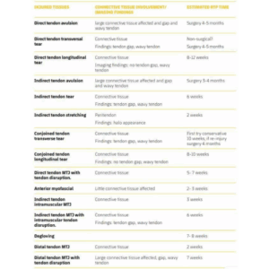 Con respecto a las lesiones musculares «indirectas», el período de tiempo para la RTP varía mucho y se considera que está relacionado con la extensión inicial de la lesión. Los detalles de las imágenes muestran que las lesiones proximales a menudo incluyen lesiones al propio tendón, lesiones “Tp”, y estas lesiones afectarán predominantemente al tendón indirecto, ya sea como lesiones por avulsión o rotura del tendón a lo largo de su curso intramuscular. Esto puede explicar por qué las lesiones proximales del recto femoral se han asociado con una duración de rehabilitación más prolongada que las lesiones distales.