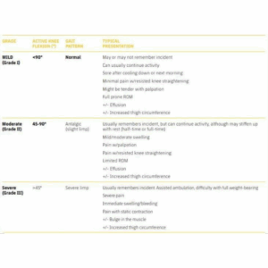 La prueba de fuerza del cuádriceps, resistiendo la extensión de la rodilla y la flexión de la cadera, en comparación con el lado sano ayudará a evaluar la gravedad de la lesión. La medición de la flexión de la rodilla se ha utilizado como indicador pronóstico en las contusiones del cuádriceps. Jackson y Feagin describieron originalmente un sistema de clasificación, que fue modificado por Ryan et al. Las contusiones leves se caracterizan por marcha normal, sensibilidad localizada y flexión activa de la rodilla superior a 90. Las contusiones moderadas se caracterizan por marcha antiálgica, masa hinchada y dolorosa en el cuádriceps y flexión activa de la rodilla de 45 a 90. Las contusiones graves se caracterizan por una marcha muy antiálgica, masa muscular notablemente hinchada y sensible, y menos de 45 de flexión activa de la rodilla. La tabla 6 resume esta clasificación. El valor pronóstico de este sistema de clasificación ha quedado demostrado ya que el tiempo medio de incapacidad es mayor en el caso de contusiones posteriormente más graves. Ryan y cols. Se encontraron tiempos de incapacidad promedio de 13 días para contusiones leves, 19 días para contusiones moderadas y 21 días para contusiones graves.